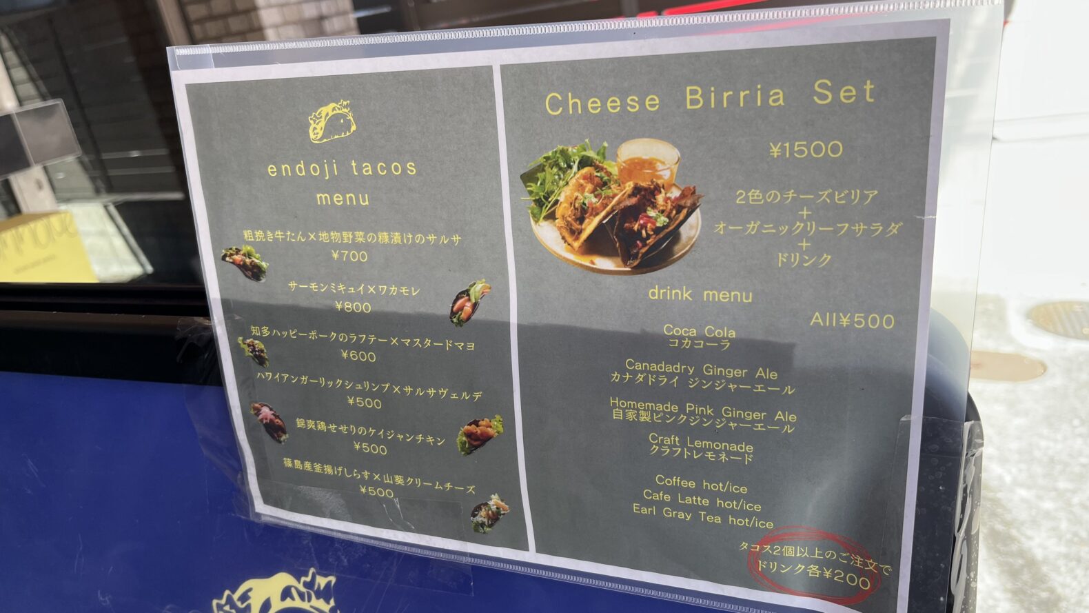 endoji tacosは、名古屋市営地下鉄鶴舞線や桜通線の丸の内駅から少し歩いた円頓寺商店街付近に2025年12月15日にオープンした、ランチタイムにタコスやチーズビリアが楽しめる専門店なんだね~!
