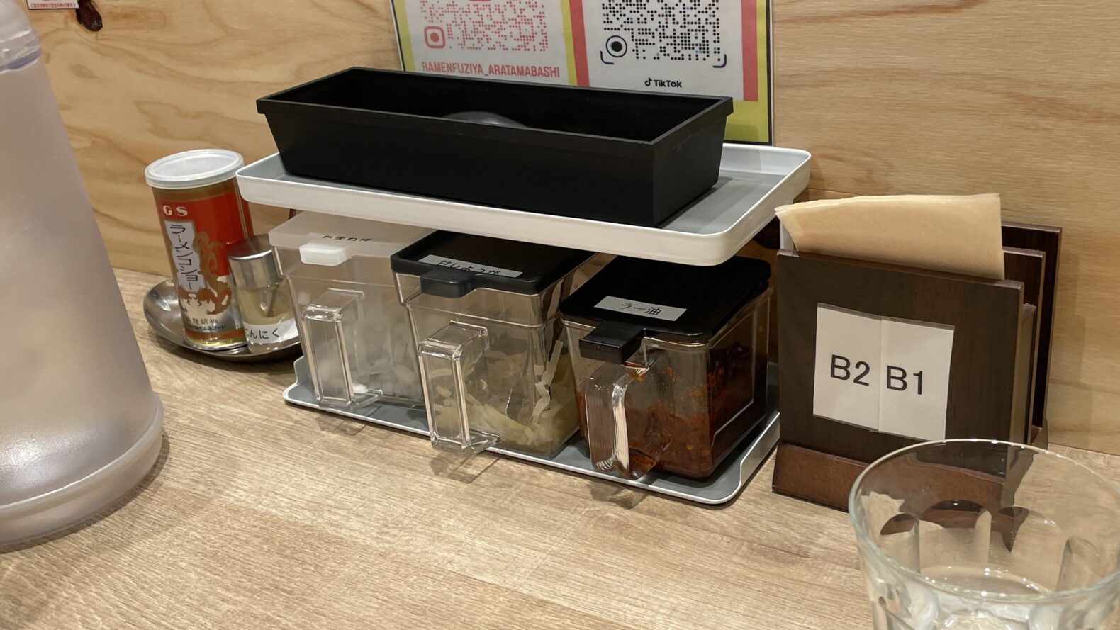 卓上にはラー油や甘しょうが・タマネギ・ニンニク・コショウがあったよ!