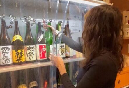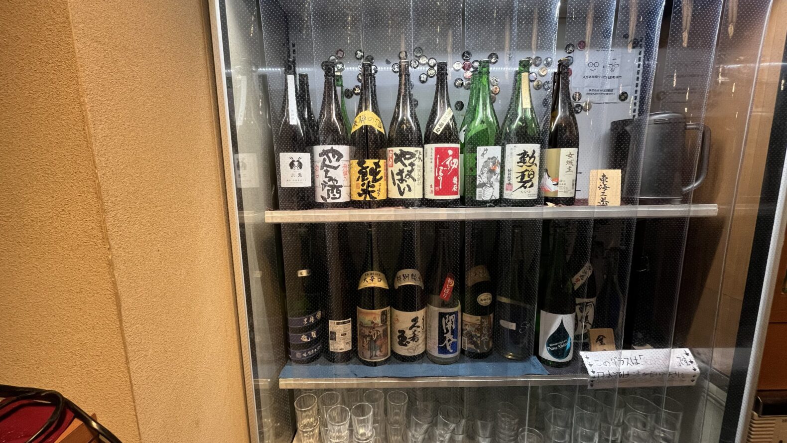 日本酒はショーケースから好きなだけ自分で注いで飲み放題だから、色んな種類の日本酒を思う存分楽しめるよ~!