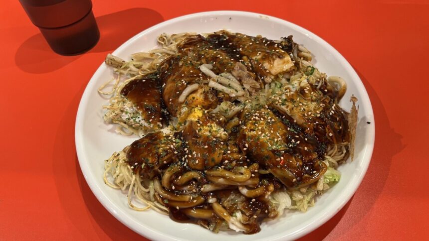 うどんとそばが両方入った、ボリューム満点なお好み焼きだよ。広島ラーメンも楽しめるお店で、気軽にお腹を満たしてね~! pic.twitter.com/szGigqaCtp