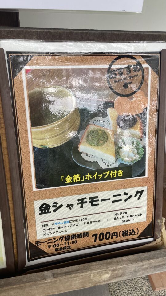 朝11時までは特別なモーニングセット、名古屋城金鯱モーニングが提供されていて、名古屋らしい小倉トーストとお抹茶が楽しめるんだよ~!
